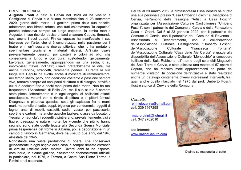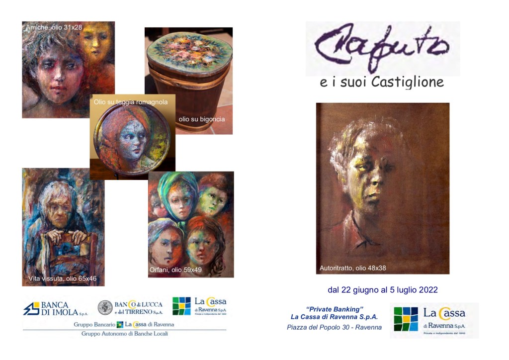 La Cassa di Ravenna S.p.A., nell’ambito delle iniziative di valorizzazione del collezionismo privato e della cultura artistica, ospita presso le proprie vetrine del “Private Banking” di Ravenna in Piazza del Popolo 30, fino al 5 luglio prossimo, una mostra dedicata a “Caputo e i suoi Castiglione”, rassegna di dipinti dello scomparso artista cervese Augusto Ponti, in arte “Caputo”.