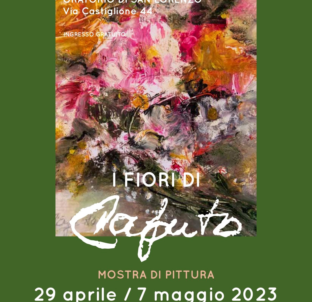 A conclusione della mostra “I FIORI DI CAPUTO”, allestita nella splendida cornice dell’Oratorio San Lorenzo, desidero ringraziare i numerosi visitatori (oltre centoventi in una sola settimana) che hanno apprezzato moltissimo la ventata di colori ed emozioni regalate dalle opere esposte. Ringrazio il Sindaco di Cervia per la concessione del Patrocinio e tutta l’Amministrazione Comunale, soprattutto l’Assessore Cesare Zavatta e il Presidente del Consiglio Comunale Gianni Grandu. Ringrazio il Consiglio di Zona di Castiglione, il suo Presidente Ciani Antonio, tutte le Associazioni Culturali coinvolte (“Menocchio”, “Casa delle Aie Cervia”, “Francesca Fontana”, “Umberto Foschi”, “Gruppo Fotografico Cervese” e “Officina Musicale Cervese”) e gli artisti e amici che sono intervenuti anche all’inaugurazione e hanno collaborato alla buona riuscita della mostra. Ringrazio Eugenio Fusignani e la professoressa Elisa Venturi perché ho sempre potuto contare sulla preziosa collaborazione di entrambi. Ringrazio Francesco Minardi e Carlo Bendandi del “Mary’s flowers”, che hanno fornito le piante e creato la composizione floreale, adattandola ai colori dell’allestimento. Ringrazio tantissimo i Maestri castiglionesi Giovanni Fabbri, Giuliano Giuliani e il professor Ennio Rossi, che hanno aiutato Caputo in qualche modo, in vita e anche ora, fornendo contributi per il catalogo e altre forme di collaborazione. Molte grazie all’artista castiglionese Alteo Missiroli, che ha gentilmente prestato diversi cavalletti. Un ringraziamento particolare a Eleonora Biondi per la preziosa collaborazione nell’allestimento della mostra.