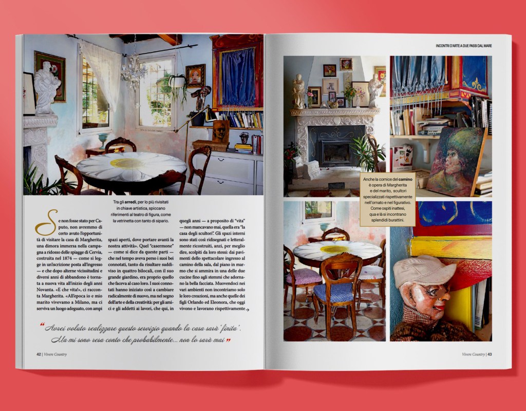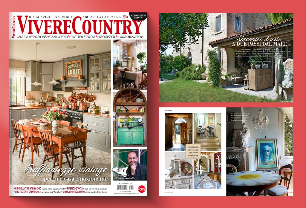 “Vivere Country” è la più amata testata italiana dedicata all’arredamento di campagna, in edicola dall’ormai lontano 2005. Protagonisti di questa rivista sono materiali naturali e ambienti rustici, perfetti per chi ama uno stile di vita sostenibile e tra le sue pagine si possono trovare tante idee di stile per arredare con originalità la propria casa ma anche consigli sul verde e suggerimenti di recupero. Sul numero 176, attualmente in edicola, uno dei servizi principali, dal titolo “Incontri d’arte a due passi dal mare”, racconta “una dimora in continuo divenire — come si legge nel sottotitolo — nelle campagne di Cervia. Da fatiscente “casermone” a “casa degli scultori”, dove qualsiasi cosa porta la firma di Margherita e famiglia. Ad eccezione dei paesaggi e dei ritratti di un ospite speciale”.