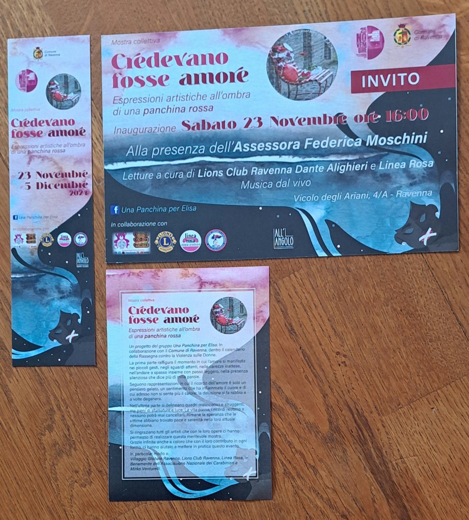 Dal 23 novembre al 5 dicembre 2024, in occasione della Giornata contro la violenza sulle donne, presso la saletta di Via degli Ariani, 4/A a Ravenna, sarà allestita una mostra collettiva di artisti vari, provenienti anche da fuori regione. Ho accettato con piacere l’invito dell’amica Flavia e del gruppo “Una panchina per Elisa” (in ricordo del femminicidio di Elisa Bravi, nel ravennate) anche perché Caputo aveva mostrato particolare sensibilità e vicinanza nei confronti di questa tragedia. L’opera “Orfani” parteciperà, quindi, a questa singolare mostra, che verrà inaugurata sabato 23 novembre, alle ore 16.00, a cui siete tutti invitati (ingresso gratuito, sia il 23, sia ciascun altro giorno); apertura dalle ore 16.00 alle ore 19.00.
