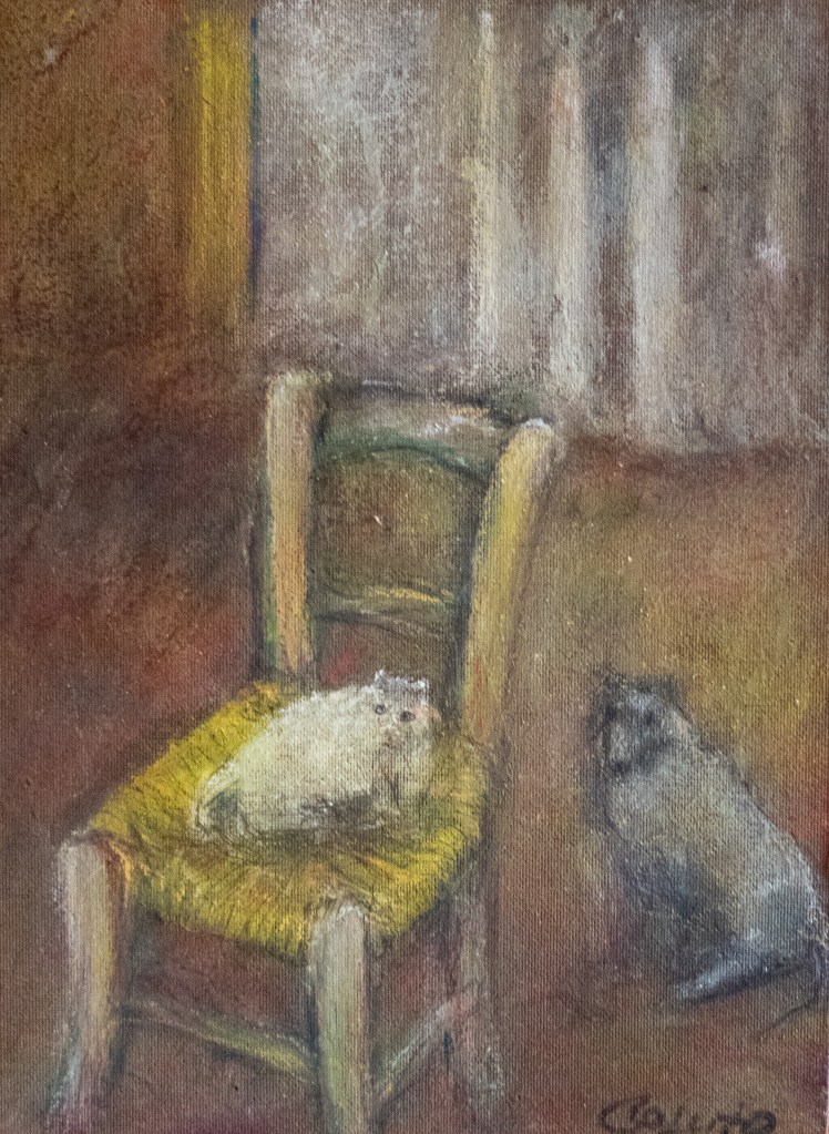 Titolo: “GATTO SU SEDIA ” Il titolo non è stato attribuito dall’artista, ma da Giovanna Pirini. L’opera è copia unica.