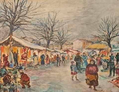 Titolo: “IL MERCATO A CASTIGLIONE” Il titolo non è stato attribuito dall’artista, ma da Giovanna Pirini. L’opera è copia unica.